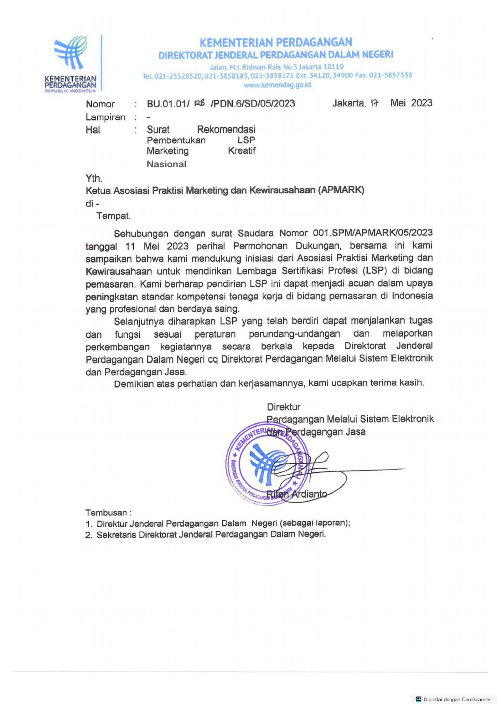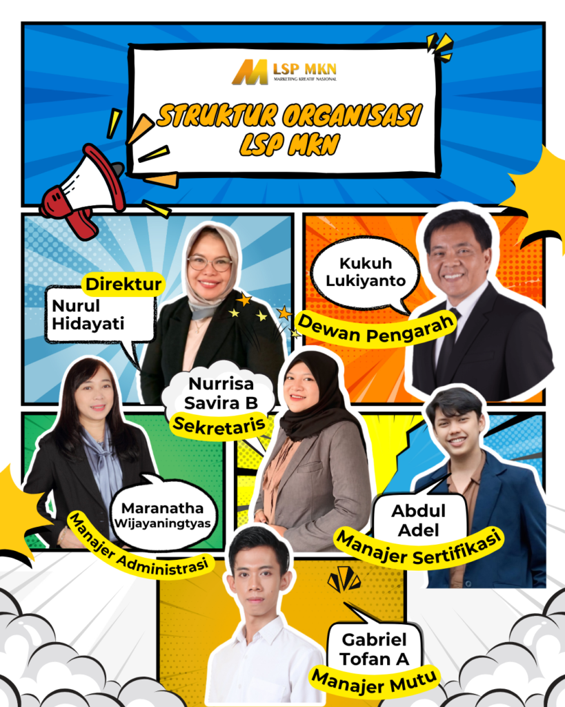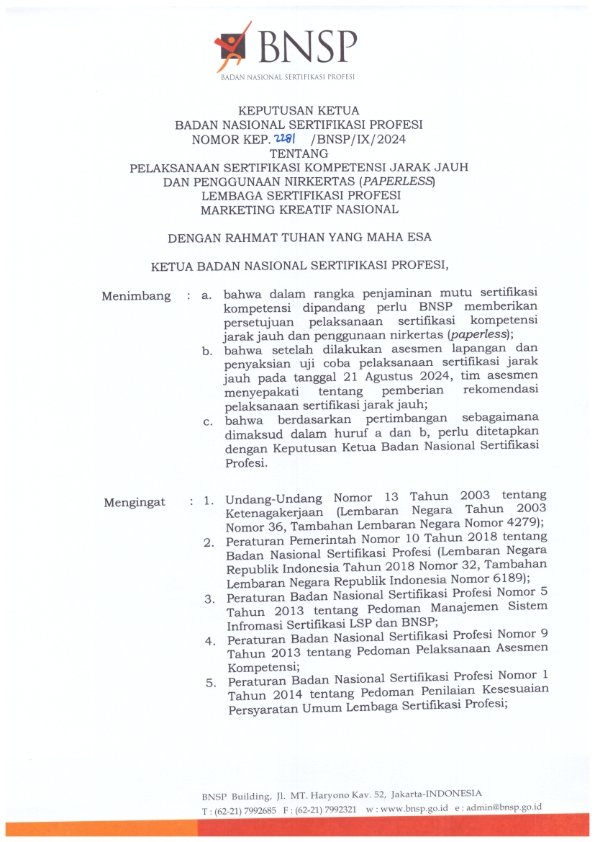 LSP Marketing Kreatif Nasional ditetapkan dengan Keputusan Ketua Badan Nasional Sertifikasi Profesi Nomor KEP.0280/BNSP/II/2024 Tentang Lisensi Lembaga Sertifikasi Profesi Marketing Kreatif Nasional dan telah mendapatkan ijin operasional dengan Sertifikat Lisensi Nomor BNSP-LSP-2432-ID yang berlaku hingga 2 Februari 2029. LSP Marketing Kreatif Nasional sejalan dengan Visi dan Misi-nya berusaha mengembangkan skema-skema baru dibidang pemasaran di era teknologi digital ini, sehingga profesi yang baru bermunculan dapat terstandarisasi